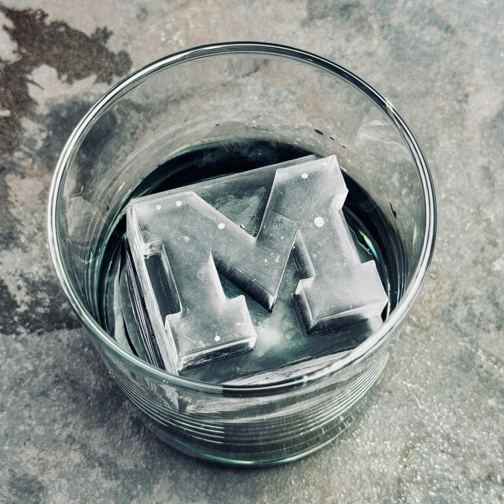 Cubito de hielo Block M con dimensiones de 2,1 x 2,1 x 2,1 pulgadas (53 mm x 53 mm x 53 mm). La M se extiende 9 mm desde la parte superior del cubito de hielo.