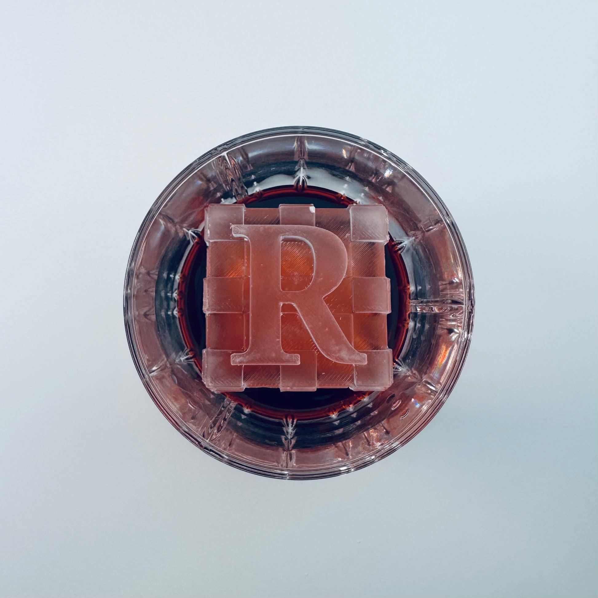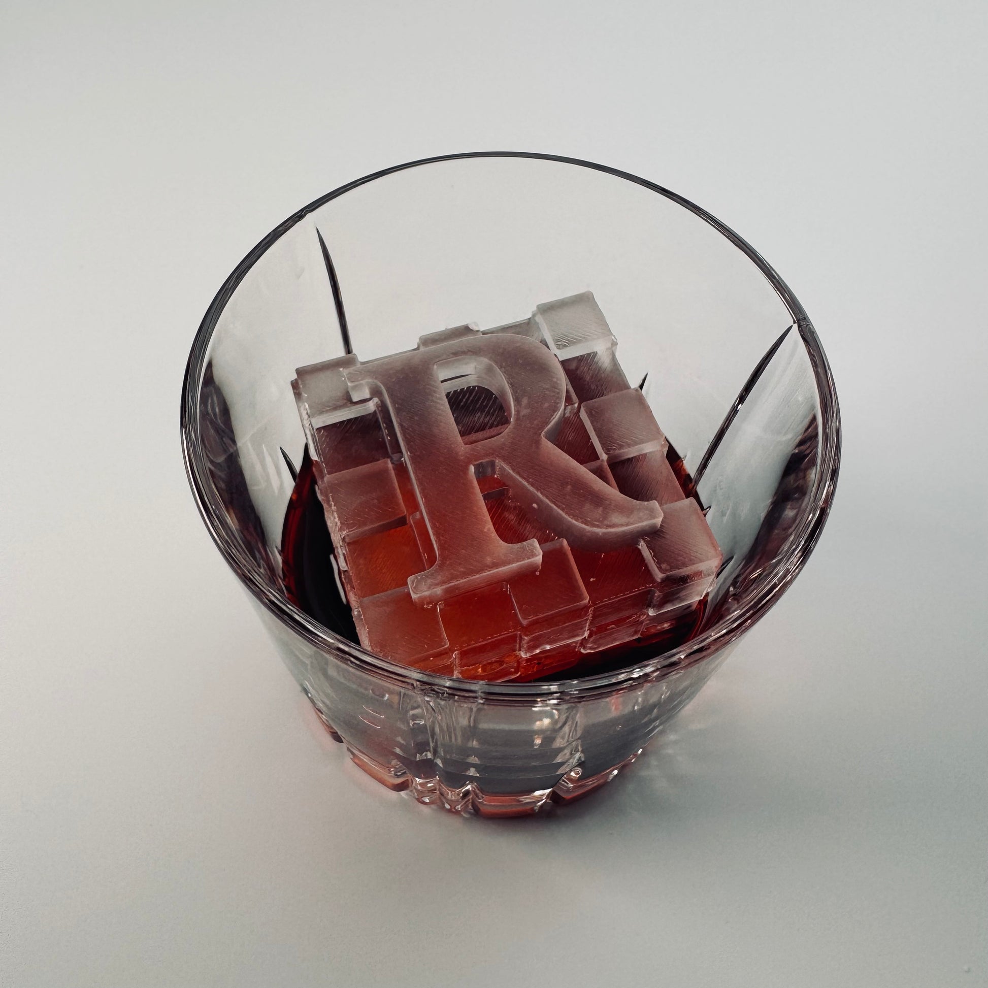 Cubito de hielo de 2,1 pulgadas de alto enmarcado. Este cubito de hielo tiene una letra enmarcada en la parte superior.