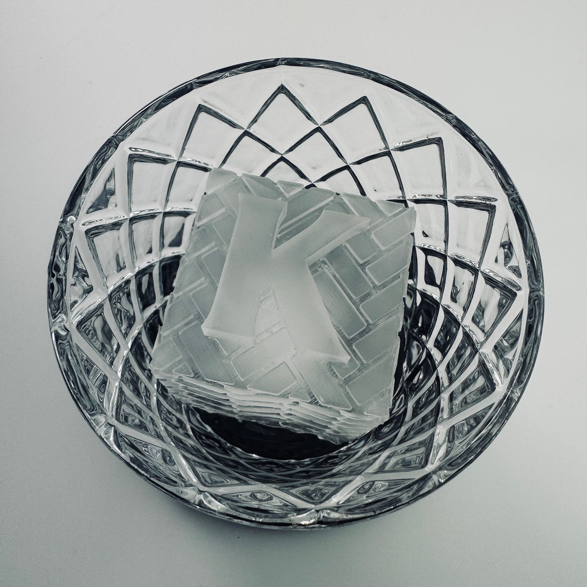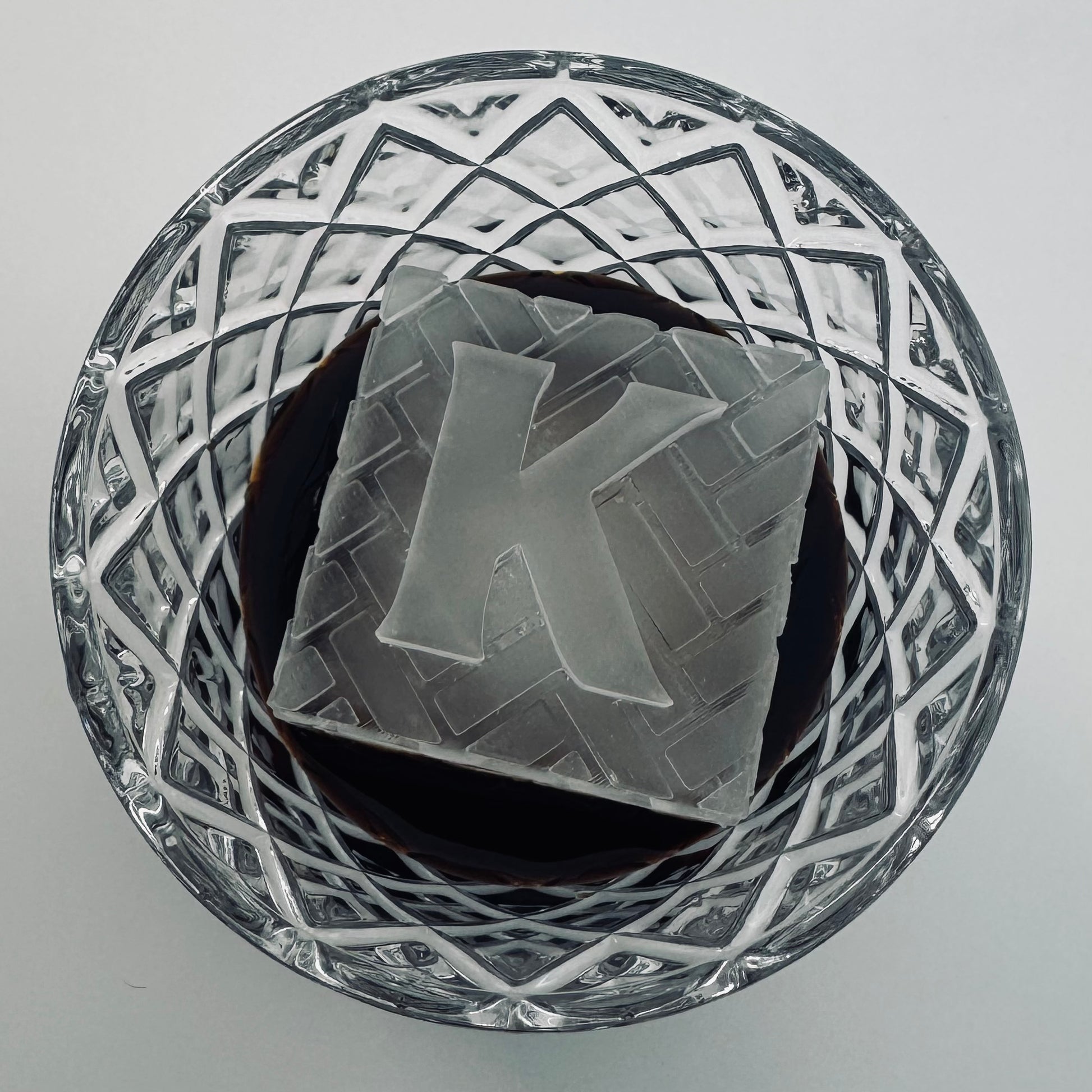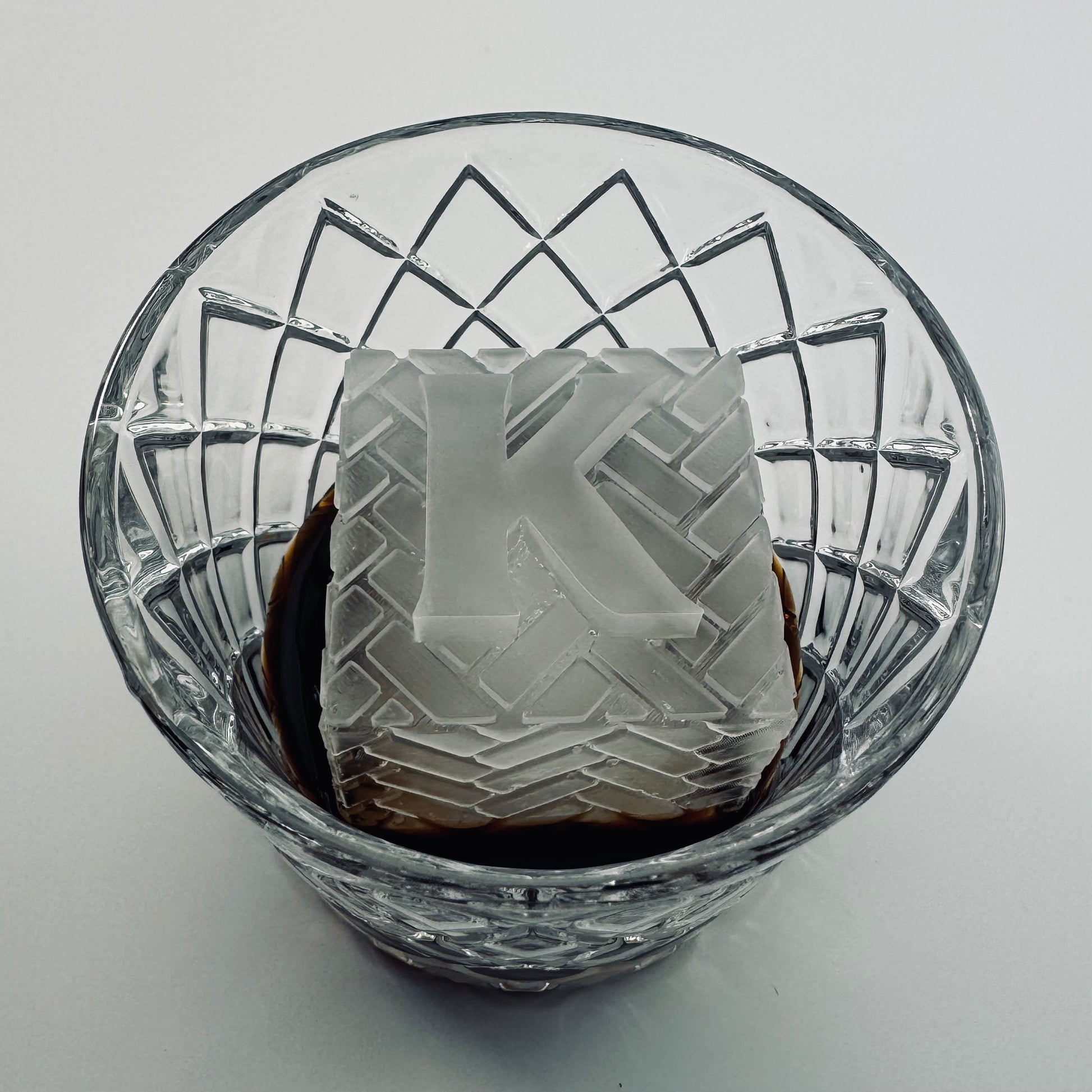 Cubito de hielo de 2,1 pulgadas de alto enmarcado. Este cubito de hielo tiene una letra enmarcada en la parte superior.