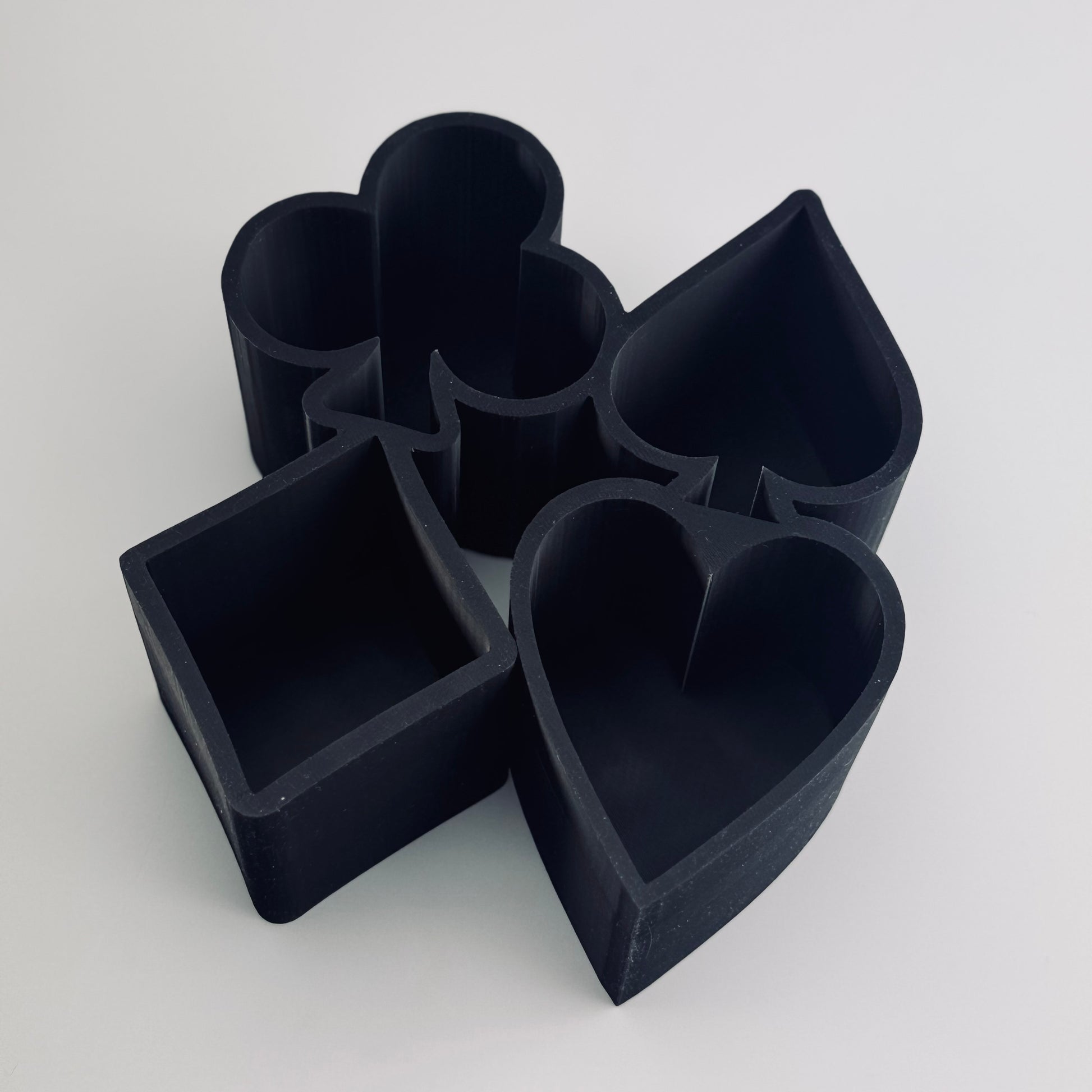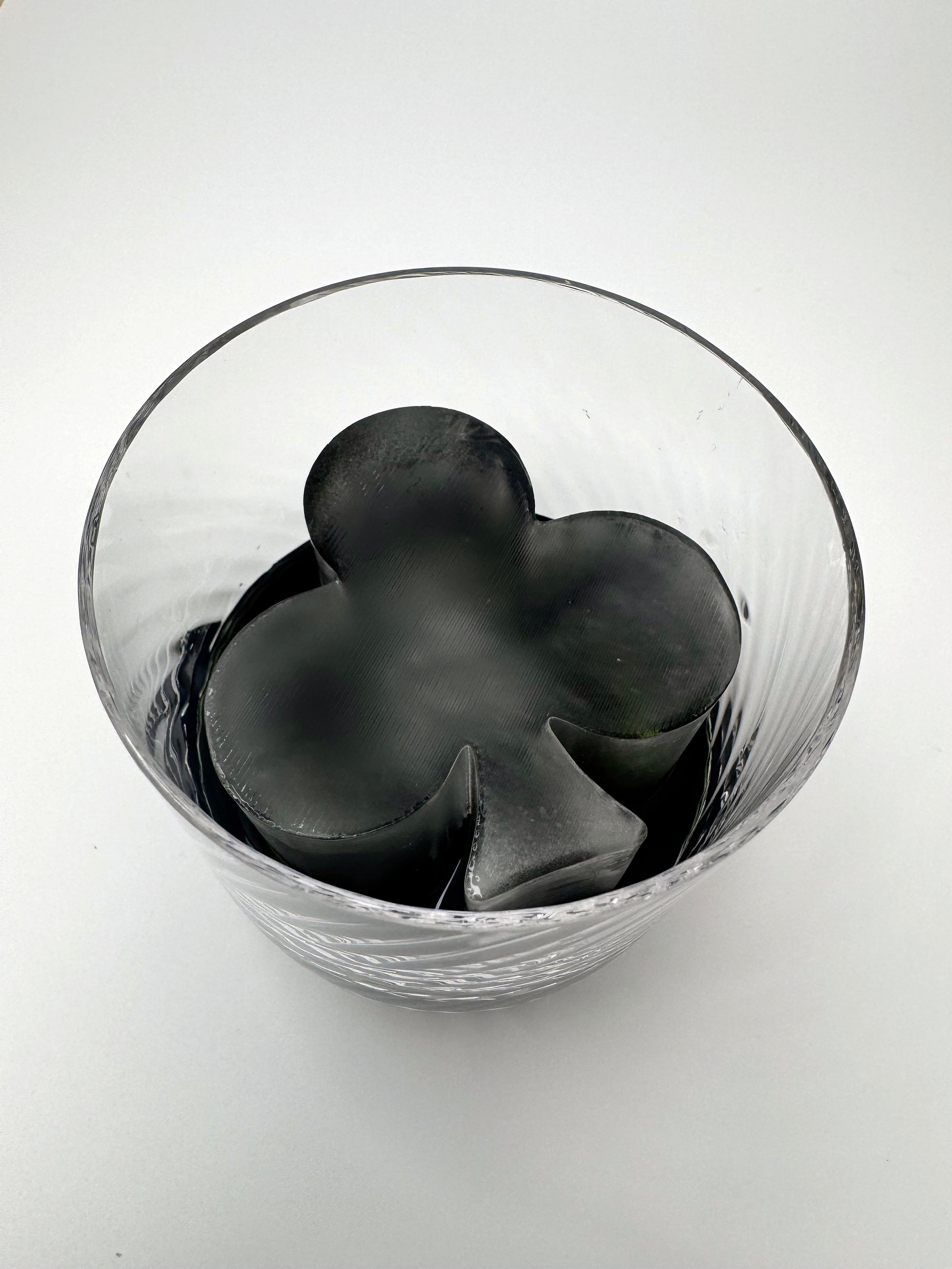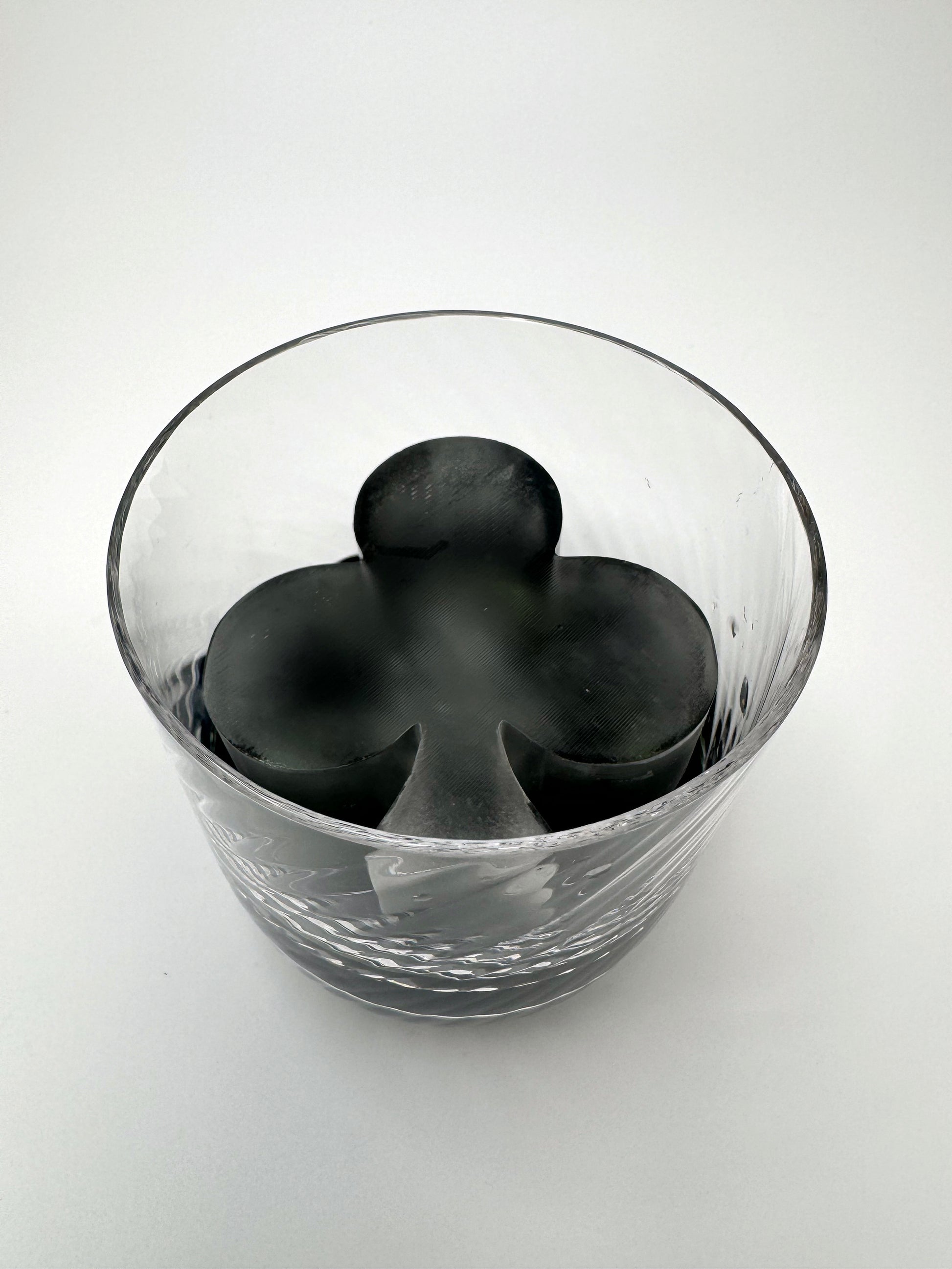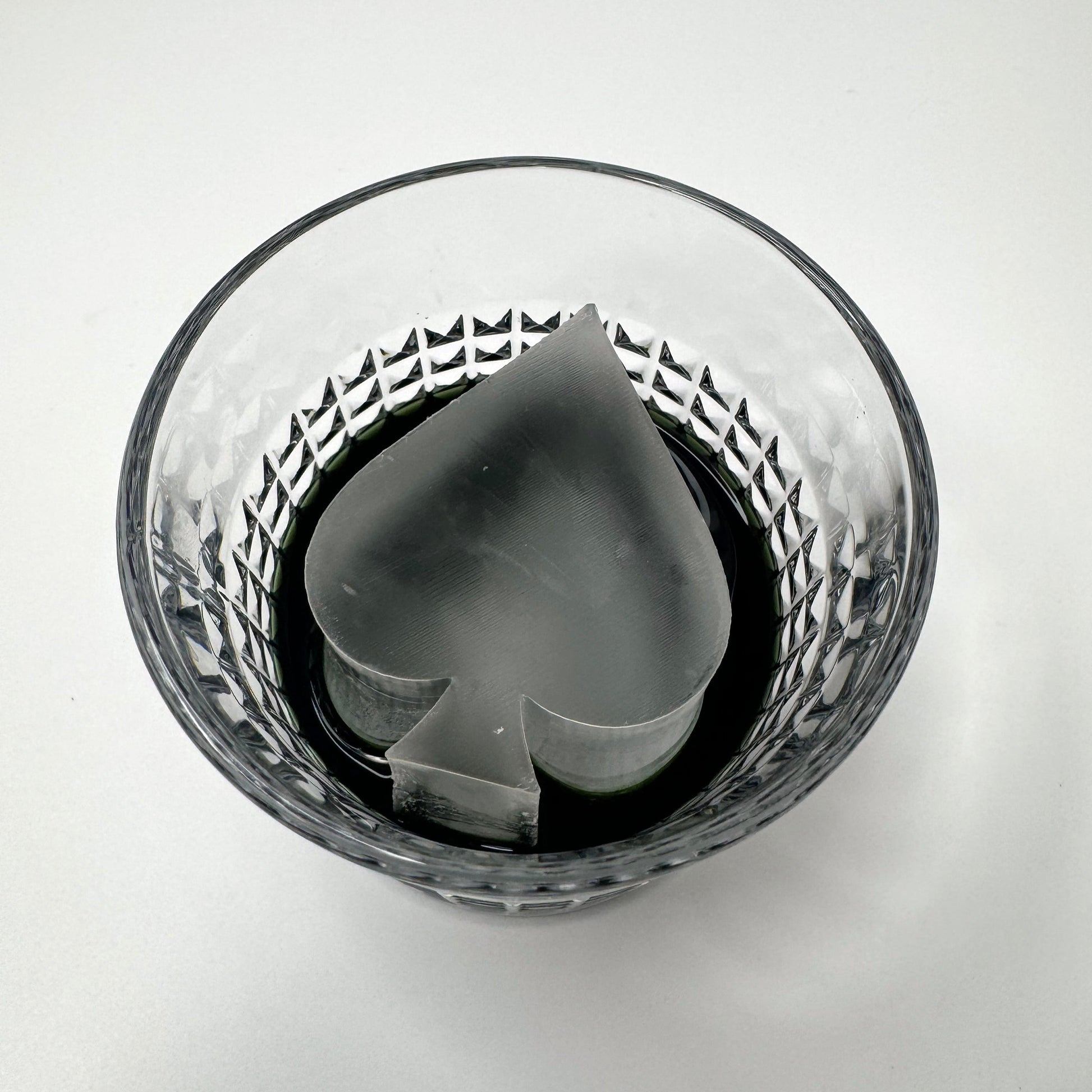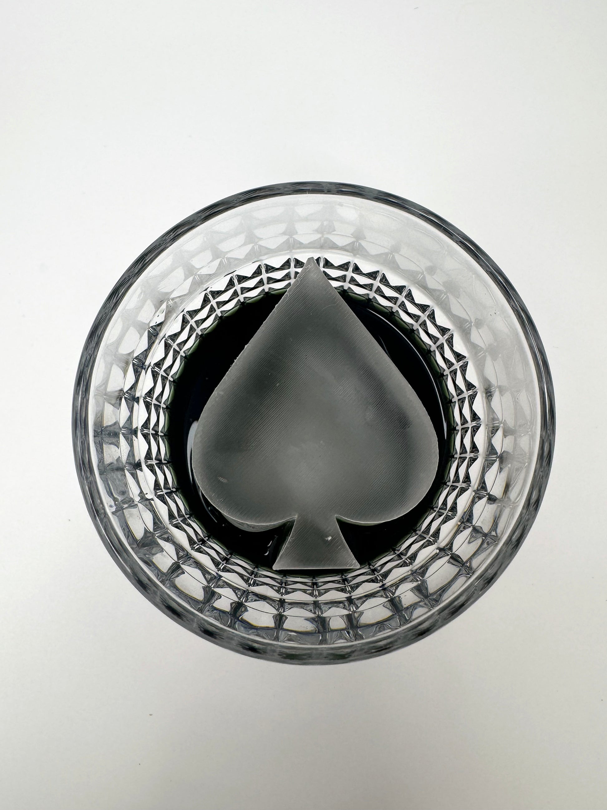 Bandeja para cubitos de hielo de póquer con los palos de espada, diamante, trébol y corazón. Disponible en versiones en relieve e invertida. Los cubitos tienen unas dimensiones aproximadas de 2 x 2 x 2,1 pulgadas (52 x 52 x 54 mm). Se recomienda utilizar un vaso de whisky con un diámetro de 3 pulgadas.