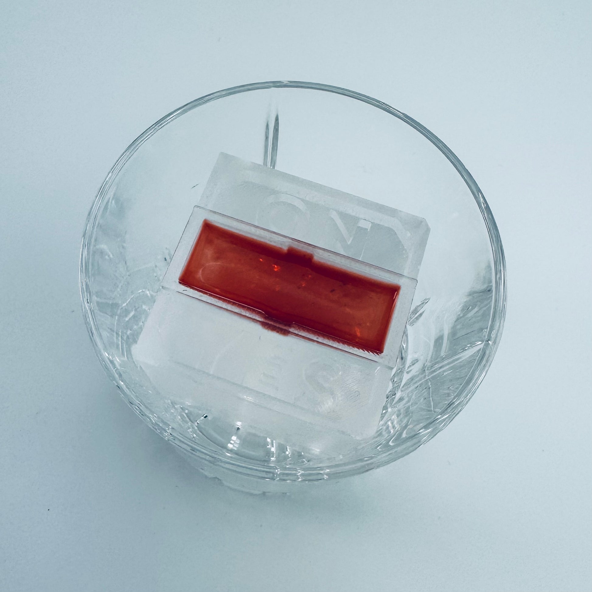4. Agrega hielo a la bebida y NO la bebida al hielo. Usa PINZAS para colocar con cuidado el hielo en la bebida. Si lo haces correctamente, la superficie superior del cubo de hielo quedará justo por encima del líquido. Esto prolongará enormemente la vida útil de tu diseño.