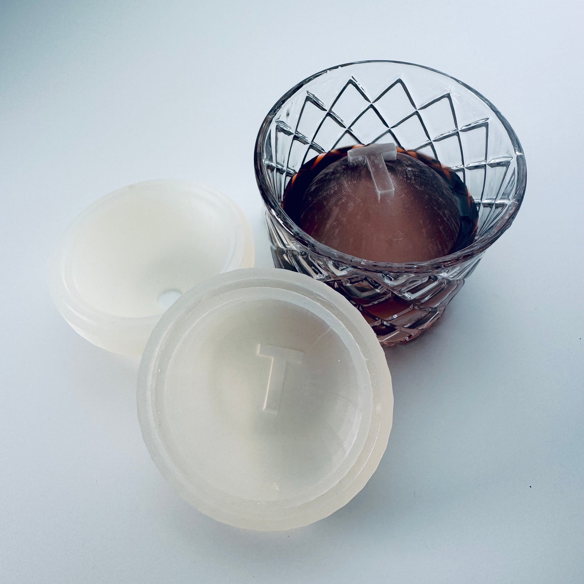Our newest mold. This 2 piece mold creates and ice sphere with a diameter of 2.6 inches and a height of 2.42 inches.