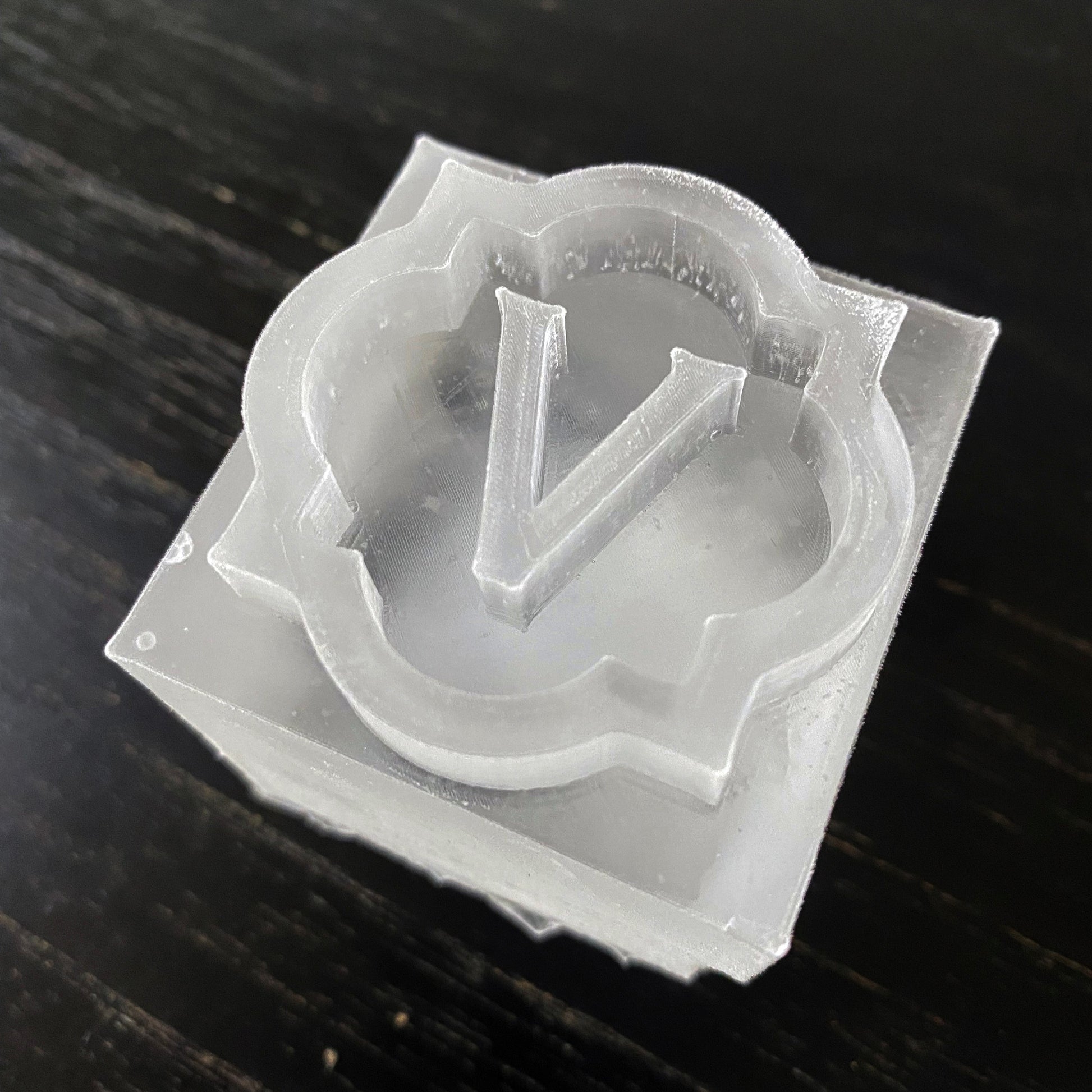 Personalized silicone ice trays in the premier framed style. Your letters are framed in the center of cube slightly higher than the outside frame. Fill in the empty space to add contrast or leave it empty.